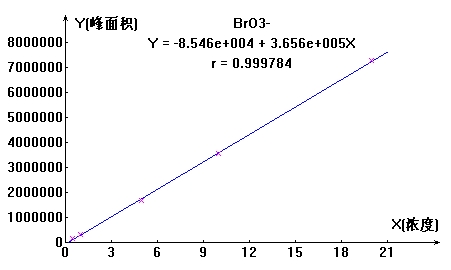 按照溴酸根各浓度点顺次进样,计较其峰面积,以浓度和峰面积绘制规范曲线,线性相干系数为0.9997,成果详见图2。