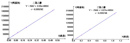 移取必然量的二氯乙酸标液(1000μg/ml)、三氯乙酸标液(1000μg/ml),设置装备摆设成的二氯乙酸(浓度为10μg/ml)、三氯乙酸(浓度为5.0μg/ml)夹杂储蓄液,再别离移取0ml、1.0ml、2.0ml、5.0ml、10.0ml的10μg/ml的二氯乙酸、三氯乙酸夹杂储蓄液至100ml玻璃容量瓶,并加超纯水定容,配制成二氯乙酸、三氯乙酸系列夹杂规范溶液,以下图4 为二氯乙酸、三氯乙酸离子规范曲线图。